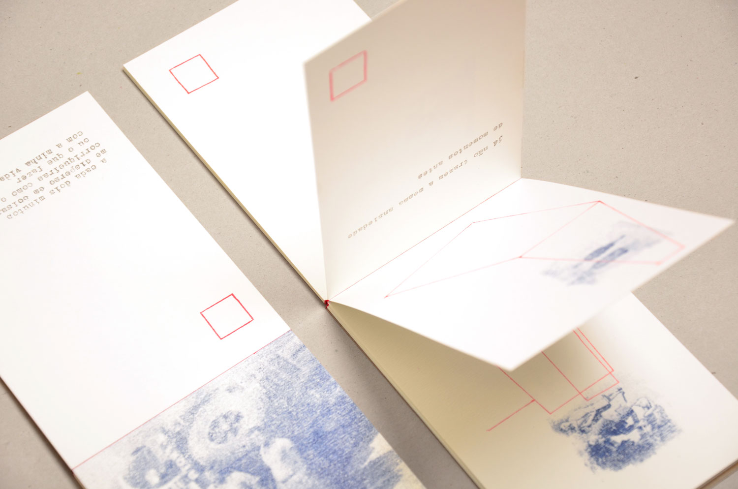 A book-series collection of postcards produced through the analogical transformation of writings and photographs found in different parts of the city. They were old photographs, with gradually fading images. The book's printing process seeks to reinforce this transformation of photographs with the use of analogical printing objects – stamps, photocopy machines, ink solvents, typewriters and duplicators – to reproduce the front images and the notes on the back. The analogical process causes, on the one hand, loss of information, and on the other hand the acquisition of a certain 'noise', which, in turn, transforms the images into something new, unrelated to its original version. These photographs and writings were randomly put together in the book and form a collection due to their common condition of having been transformed and reproduced; at the same time, however, the postcard format prompts this collection to be once again dispersed.